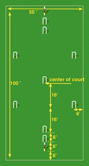 The side that wins the coin toss chooses colors; blue plays first. Each ball is played into the game from a point halfway between the finishing stake and wicket #1. (If scaling down the court, maintain the 6' distance between each stake and its nearest wicket.)